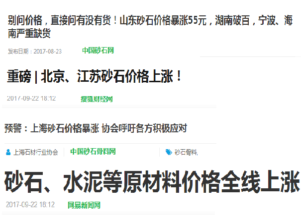 重磅!重磅!中国砂石骨料网统计分析:2017年,国内各个地区砂石,尤其是细砂骨料面临大幅上涨趋势,且涨幅吓人,从我国16个大中型城市砂石价格监测数据分析,2017年6月较之去年,上海、北京、岳阳、邯郸、山东、宜昌、唐山等地骨料涨幅均已超过40%,部分地区甚至出现了1倍多的上涨率。
