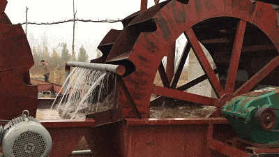 轮斗洗砂机在水力作用下将山砂中的石粉清洗掉,如上所示