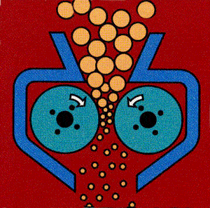 利用辊面的摩擦力将物料咬入破碎区,使之承受挤压或劈裂而破碎的机械。当用于粗碎或需要增大破碎比时,常在辊面上做出牙齿或沟槽以增大劈裂作用。在进料不能破碎的物料时,比如金属物,辊子间的间隙会自动变大,因为由弹簧在后面顶住,硬物破碎不了会把弹簧顶开,辊子会向后移动。