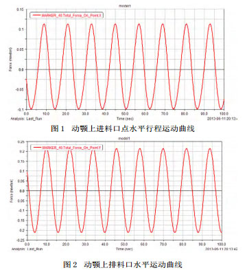 图1 动颚上进料口点水平行程运动曲线图2 动颚上排料口水平运动曲线从破碎机进料口点的水平位移曲线( 如上图 1 所示 )、垂直位移曲线(省略)均可以看出这点的平均较大水平行程距离大约为3.5 cm;从出料口C 点的水平曲线图(如图 2 表示)、垂直位移曲线(由图表表示)都可得出 C 点的平均较大水平行程大约2.5cm,其中平均较大垂直行程约为4 cm。颚式破碎机动颚板的平均水平行程较原来更大,确保动颚板对物料施加相当大的挤压力,并且破碎腔从上到下的水平行程是递减的,确保排料通畅。而且从上述图表可以看出动颚垂直行程相对比较小,从而减少了过粉碎和磨损,既有利于破碎过程也有利于排料过程,并且破碎效果良好。
