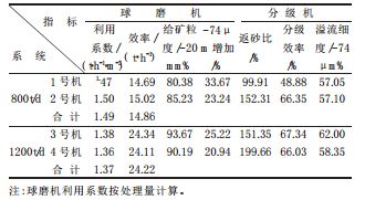 一般来说,除球磨机规格、新给矿量和钢球等因素以外,物料在磨机内停留时间主要决定于返砂比和给矿、返砂冲洗水量。1号机因返砂比低,排矿和返砂中细粒级含量也高,分级效率相对较低,这就是1号机各项技术指标较为异常的根本原因。